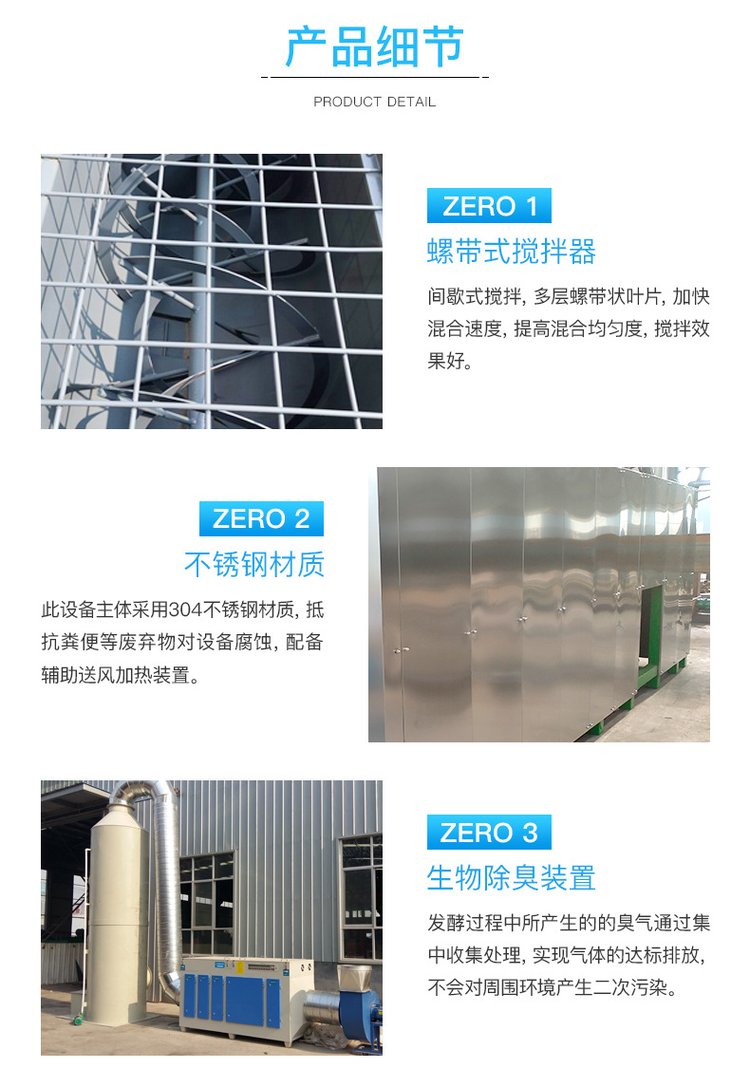本设备不使用锯末、木屑等水分调整材料,在对高水分原材料进行好氧高温发酵的同时,使高水份原料得到干燥;好氧发酵是一种恶臭发生少,节省能源获得有机肥的处理方法。为了促进好氧性发酵需具备以下条件:(a)水分含量(b)空气(c)湿度(d)PH值、(e)碳氮比。以上条件需适当调整,不得含有阻碍高温菌种繁殖的化学品,为了达到产品的均一性以及为了加快干燥需连续操作送入适量的空气。